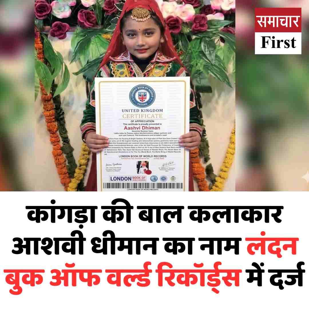 कांगड़ा जिले के जयसिंहपुर क्षेत्र के सलियाणा गांव की होनहार बाल कलाकार आशवी धीमान ने एक बार फिर हिमाचल प्रदेश का नाम राष्ट्रीय ही नहीं बल्कि अंतरराष्ट्रीय स्तर पर भी रोशन किया है। यूनाइटेड किंगडम की प्रतिष्ठित संस्था लंदन बुक ऑफ वर्ल्ड रिकॉर्ड्स ने आशवी को “Certificate of Appreciation” से सम्मानित किया है। इसी सम्मान के साथ उनका नाम आधिकारिक रूप से London Book of World Records में दर्ज हो गया है। यह उपलब्धि कम उम्र में उनकी असाधारण प्रतिभा और लगातार मेहनत का बड़ा प्रमाण मानी जा रही है।