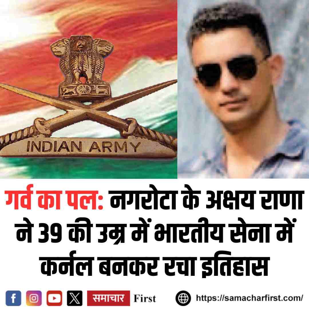नगरोटा बगवां: हिमाचल प्रदेश के कांगड़ा जिले के नगरोटा के रहने वाले अक्षय राणा ने भारतीय सेना में कर्नल का पद प्राप्त कर एक बेहतरीन उपलब्धि हासिल की है। मात्र 39 वर्ष की आयु में यह पद प्राप्त करना उनके दृढ़ संकल्प, अनुशासन और समर्पण का एक ज्वलंत उदाहरण है। कर्नल अक्षय राणा, ओम प्रकाश राणा के पुत्र हैं। उनकी इस उपलब्धि से उनका परिवार और पूरा समुदाय अत्यंत हर्षित और गौरवान्वित महसूस कर रहा है।