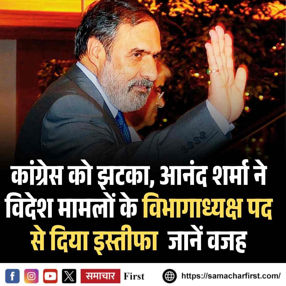 कांग्रेस पार्टी को रविवार को एक बड़ा झटका लगा जब पूर्व केंद्रीय मंत्री और पार्टी के वरिष्ठ नेता आनंद शर्मा ने अखिल भारतीय कांग्रेस कमेटी (AICC) के विदेश मामलों के विभाग (DFC) के अध्यक्ष पद से इस्तीफा दे दिया। हालांकि, वे कांग्रेस कार्यसमिति (CWC) के सदस्य बने रहेंगे। शर्मा ने यह कदम पार्टी में युवाओं को आगे लाने और विभाग के पुनर्गठन के उद्देश्य से उठाया है।