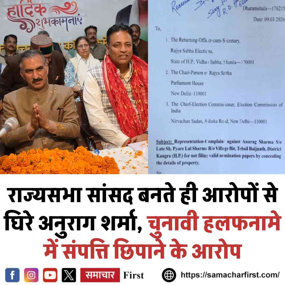 शिकायत में कहा गया है कि गांव बीड़, तहसील बैजनाथ, जिला कांगड़ा निवासी अनुराग शर्मा को 7 मार्च 2026 को हिमाचल प्रदेश से राज्यसभा के लिए निर्वाचित घोषित किया गया था। लेकिन उनके नामांकन के साथ दाखिल किए गए चुनावी हलफनामे में उनकी सभी संपत्तियों का पूरा और सही विवरण नहीं दिया गया। शिकायतकर्ता के अनुसार यह जनप्रतिनिधित्व अधिनियम 1951 की धारा 33 के तहत अनिवार्य है कि उम्मीदवार अपनी चल और अचल संपत्ति का पूरा विवरण हलफनामे में दर्ज करे।