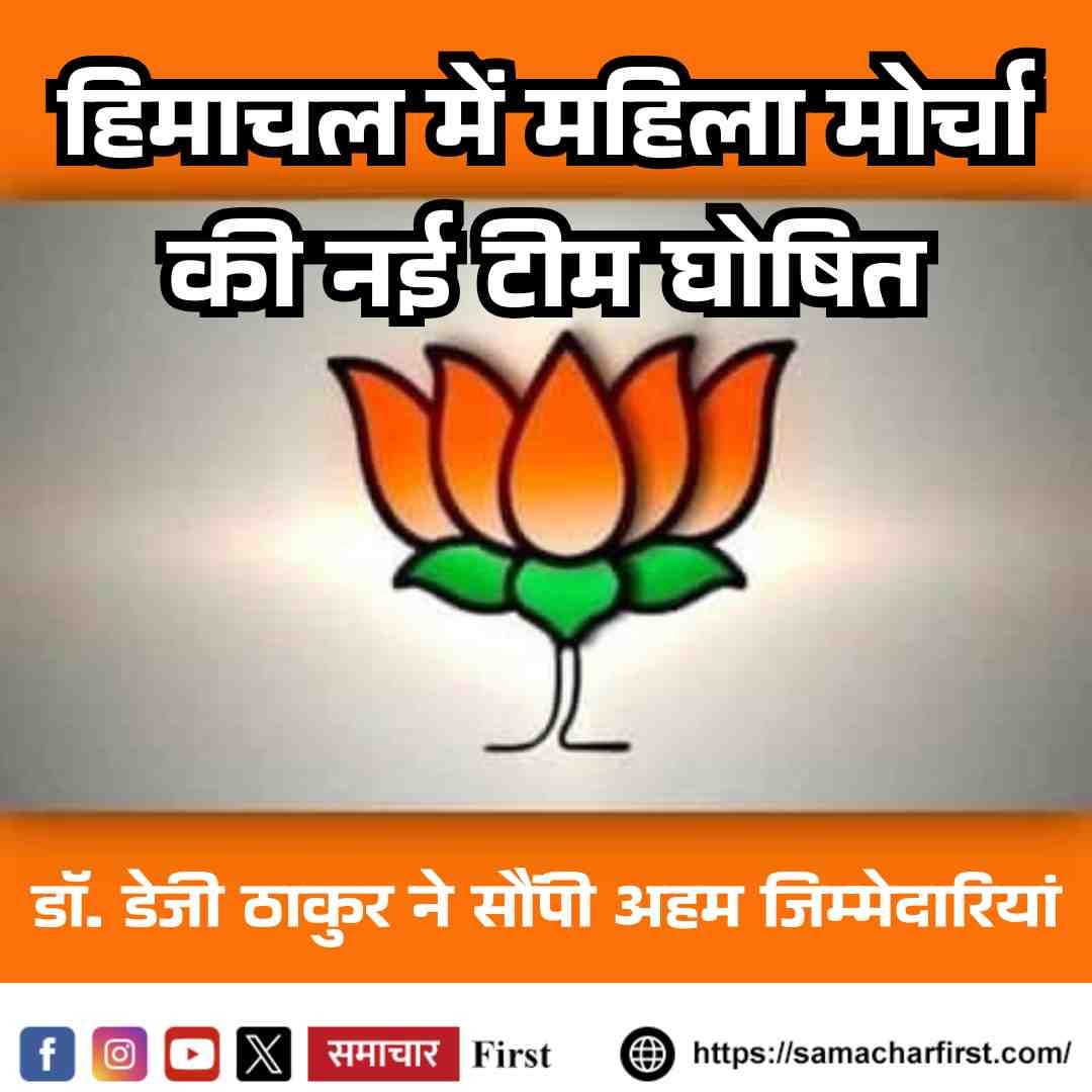 भारतीय जनता पार्टी महिला मोर्चा, हिमाचल प्रदेश की प्रदेश अध्यक्ष डॉ. डेजी ठाकुर ने संगठन को नई ऊर्जा देने के उद्देश्य से महिला मोर्चा की नई प्रदेश कार्यकारिणी की घोषणा की है। यह नियुक्तियां प्रदेश नेतृत्व से विचार-विमर्श के बाद की गई हैं और तत्काल प्रभाव से लागू होंगी।