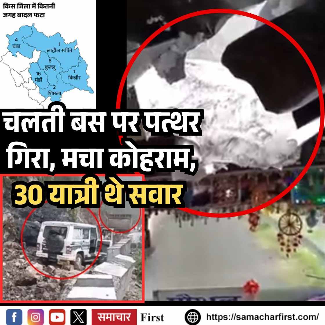 हिमाचल प्रदेश में लगातार हो रही भारी बारिश ने आम जनजीवन अस्त-व्यस्त कर दिया है। सोमवार रात और मंगलवार सुबह कई इलाकों में तेज बारिश के कारण लैंडस्लाइड और पेड़ों के गिरने से नुकसान हुआ। चंबा के चुराह में आज सुबह एक बड़ा हादसा टल गया, जब पहाड़ी से गिरा विशाल पत्थर चलती प्राइवेट बस की छत को चीरता हुआ अंदर घुस गया। यह पत्थर बस की दूसरी और तीसरी सीट पर गिरा, जहां उस वक्त यात्री बैठे थे। गनीमत रही कि हादसे में 30 में से कोई भी यात्री घायल नहीं हुआ। बस चांजू से देवीकोठी की ओर जा रही थी।