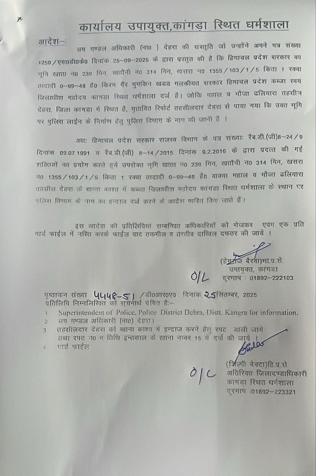 देहरा। पुलिस जिला देहरा के लिए लंबे समय से प्रतीक्षित पुलिस लाइन निर्माण का रास्ता आखिरकार साफ हो गया है। प्रदेश सरकार ने ढलियारा में पुलिस विभाग को एक हेक्टेयर भूमि प्रदान कर दी है। उपायुक्त कांगड़ा ने 25 सितंबर 2025 को इस भूमि को पुलिस विभाग के नाम हस्तांतरित करने के आदेश जारी किए। इस बड़े फैसले से न सिर्फ देहरा बल्कि पूरे पुलिस जिले को मजबूत प्रशासनिक ढांचा मिलेगा।