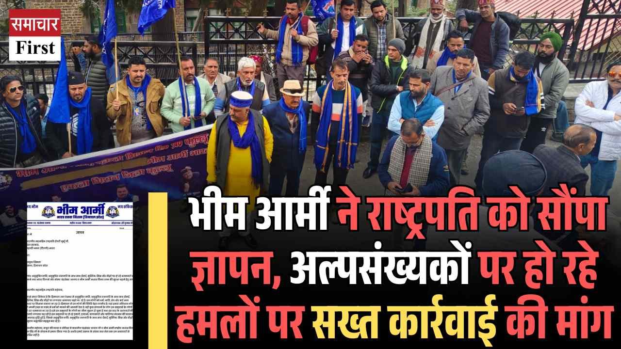 Bhim Army protest memorandum: शिमला में आज भीम आर्मी भारत एकता मिशन हिमाचल प्रदेश ने डीसी ऑफिस में एडीसी के माध्यम से महामहिम राष्ट्रपति को एक ज्ञापन सौंपा। इस ज्ञापन में देश और प्रदेश में अल्पसंख्यक समुदायों—सिख, ईसाई, बौद्ध, मुस्लिम और अनुसूचित जाति के लोगों पर हो रहे हमलों को लेकर कड़ी कार्रवाई की मांग की गई।