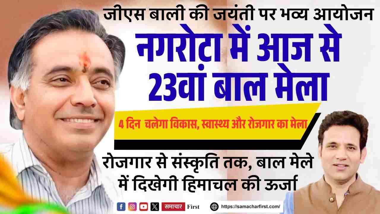 विकास की विरासत को नई ऊर्जा दे रहे हिमाचल प्रदेश पर्यटन विकास निगम के चैयरमेन रैंक कैबिनेट एवं नगरोटा बगवां के विधायक आरएस बाली की अगुवाई में आज से नगरोटा बगवां में 23वां बाल मेला शुरू होगा । यह आयोजन स्व. जीएस बाली की 71वीं जयंती को समर्पित है, जिनकी सोच और सेवा ने इस क्षेत्र ही नहीं हिमाचल को भी तरक्की की दिशा दी। इस आयोजन को न सिर्फ उनके श्रद्धांजलि स्वरूप देखा जा रहा है, बल्कि यह युवाओं, विद्यार्थियों और आम जनमानस के लिए एक समर्पित मंच बनकर उभरा है।