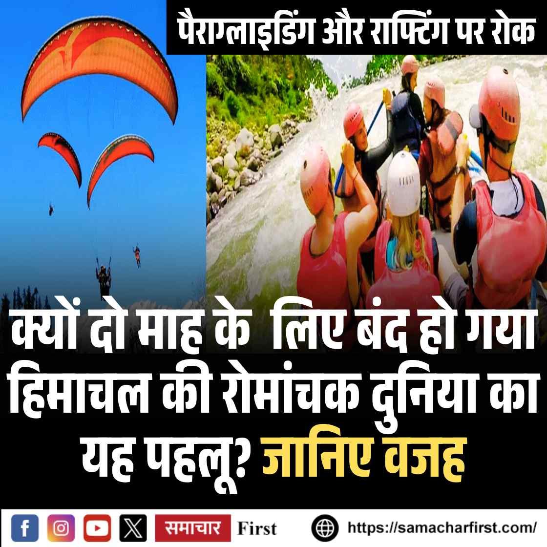 हिमाचल प्रदेश में साहसिक गतिविधियों पर प्रतिबंध को लेकर पर्यटन विभाग ने एक महत्वपूर्ण अधिसूचना जारी की है। 15 जुलाई से लेकर 15 सितंबर 2025 तक राज्यभर में पैराग्लाइडिंग, रिवर राफ्टिंग, वॉटर स्पोर्ट्स सहित सभी साहसिक गतिविधियों पर रोक लगाई गई है। यह निर्णय मानसून सीजन में संभावित खतरे और सुरक्षा कारणों के चलते लिया गया है।