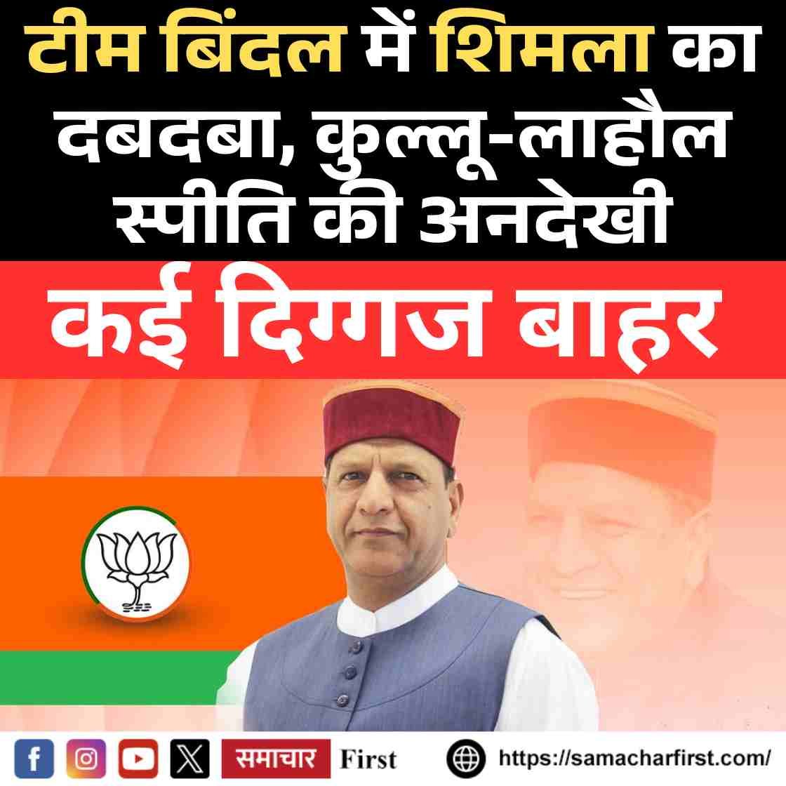 हिमाचल प्रदेश भारतीय जनता पार्टी के प्रदेश अध्यक्ष डॉ. राजीव बिंदल ने अपनी नई टीम में 10 जिलों के 35 पदाधिकारी शामिल किए हैं। लेकिन इस सूची से कुल्लू और लाहौल-स्पीति जैसे जिलों को पूरी तरह नज़रअंदाज़ किया गया है। इतना ही नहीं, मुस्लिम समुदाय से भी किसी नेता को इस कार्यकारिणी में जगह नहीं दी गई, जबकि पहले की कार्यकारिणी में बिलाल शाह और राजबलि जैसे नाम मौजूद थे। वहीं त्रिलोक कपूर, डा राजीव सहजल और गोविंद ठाकुर को भी बाहर रखा गया है।