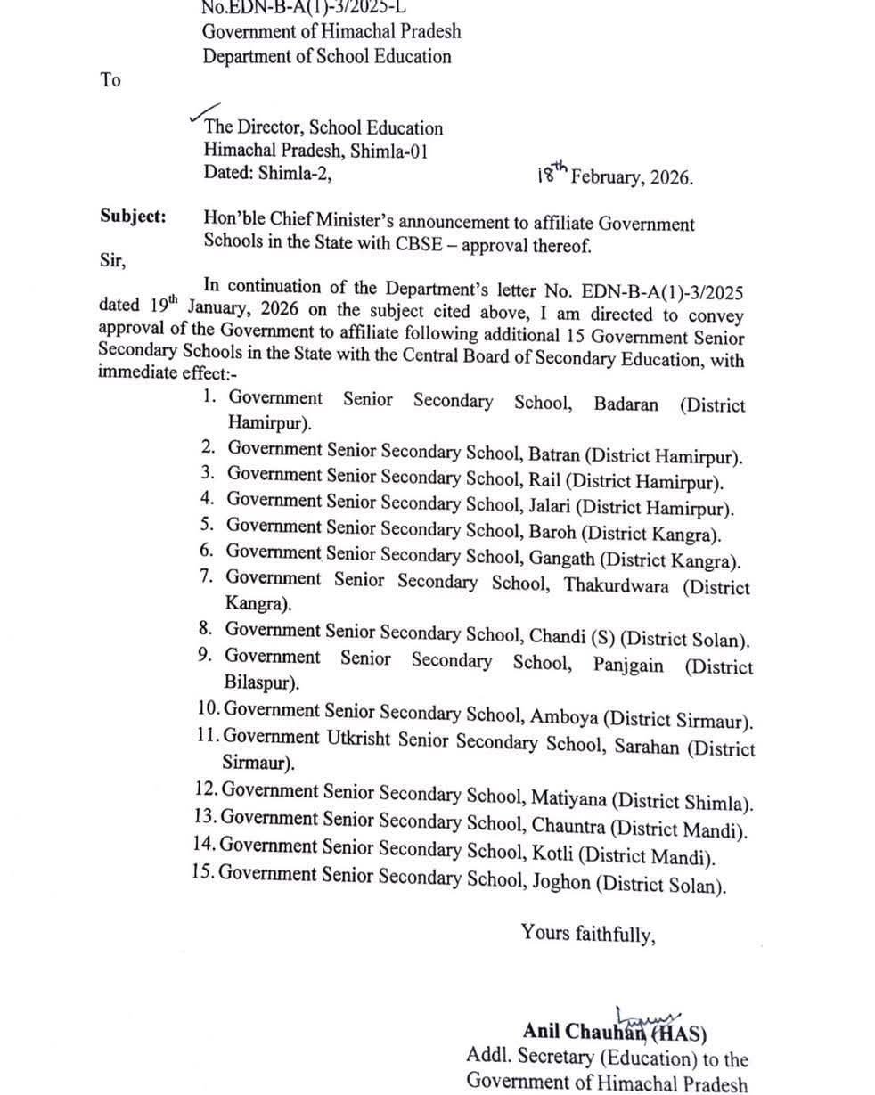 :हिमाचल प्रदेश सरकार ने 15 अतिरिक्त सरकारी स्कूलों को Central Board of Secondary Education (CBSE) से संबद्ध करने की मंजूरी दे दी है। मुख्यमंत्री Sukhvinder Singh Sukhu द्वारा की गई घोषणा के अनुपालन में, शिक्षा विभाग ने 18 फरवरी 2026 को इस संबंध में अधिसूचना जारी की। यह निर्णय विद्यार्थियों को राष्ट्रीय स्तर की प्रतियोगी परीक्षाओं के लिए तैयार करने और गुणवत्तापूर्ण शिक्षा सुनिश्चित करने के उद्देश्य से लिया गया है।