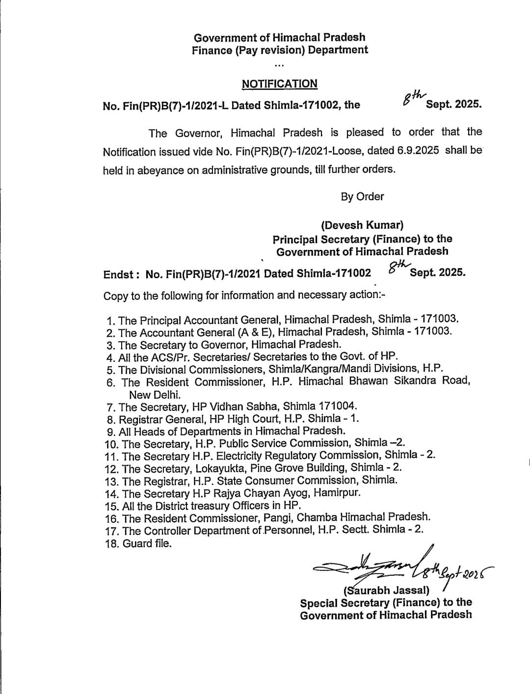 शिमला। विरोध और कर्मचारी संगठनों के दबाव के बाद हिमाचल प्रदेश सरकार ने आखिरकार हायर ग्रेड पे (राइडर) से जुड़ी अधिसूचना पर रोक लगा दी है। इसकी अधिसूचना जारी हो गई है।विरोध में कर्मचारी मुख्यमंंत्री सुखविंदर सिंह सुक्खू से मिले थे और प्रतिनिधिमंडल ने स्पष्ट कहा कि था कि यह अधिसूचना कर्मचारी हित में नहीं है और इससे हजारों कर्मचारियों की मासिक सैलरी में 10 से 20 हजार तक की कटौती हो रही है।