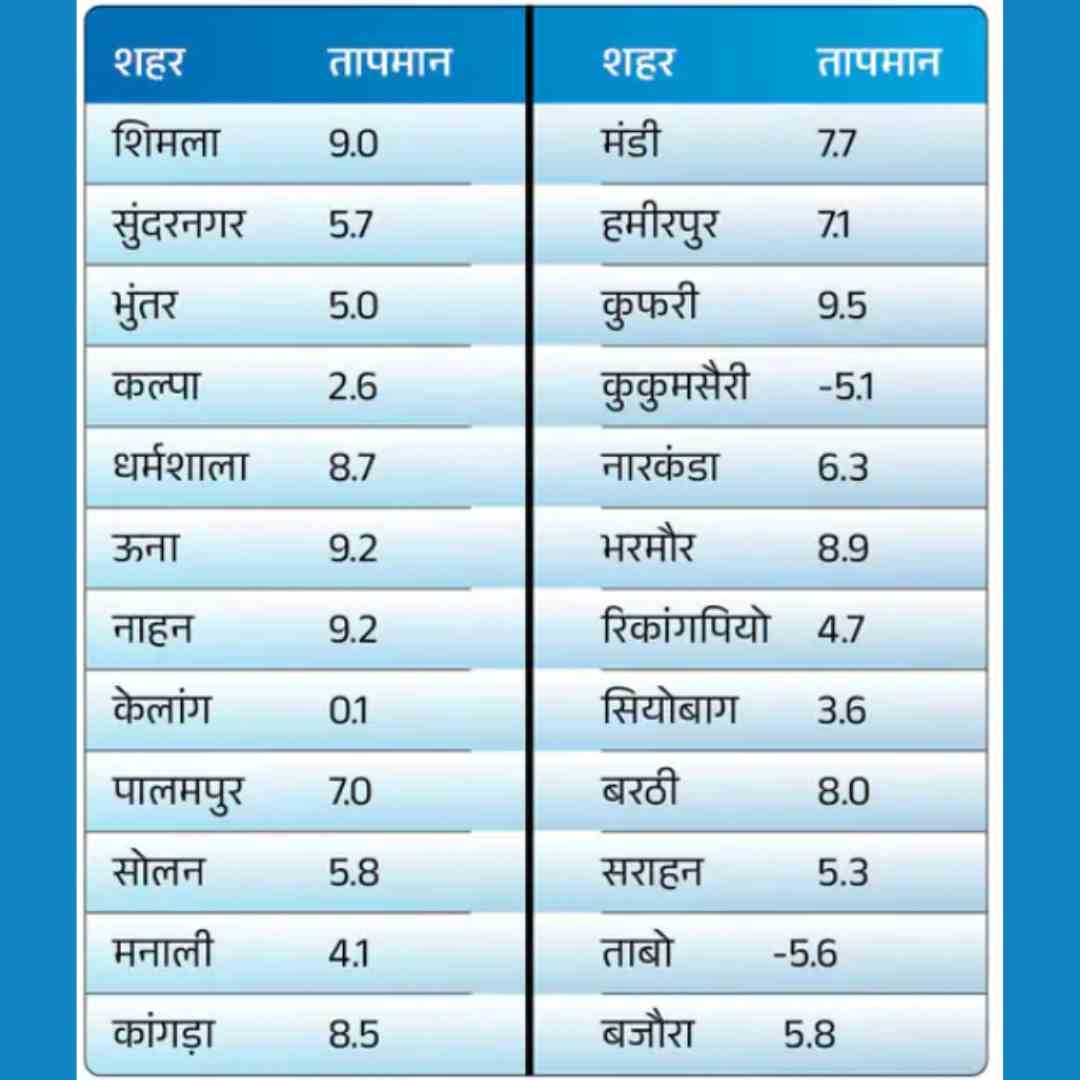 राज्य के 24 शहरों में न्यूनतम तापमान 10 डिग्री से नीचे दर्ज हुआ है। ताबो का तापमान -5.6°C और कुकुमसेरी का -5.1°C पहुंच गया, जो इस सीजन का सबसे कम तापमान है।