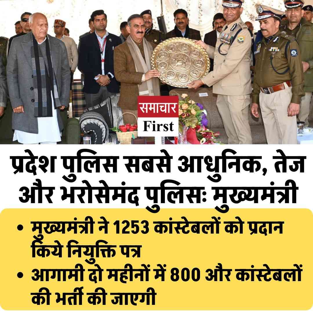 मुख्यमंत्री ने घोषणा की कि आगामी दो महीनों में 800 और कांस्टेबलों की भर्ती की जाएगी। उन्होंने कहा कि इससे हिमाचल प्रदेश पुलिस और सशक्त होगी तथा कानून व्यवस्था को और प्रभावी ढंग से लागू किया जा सकेगा।