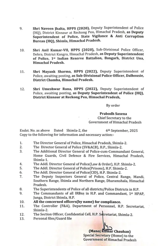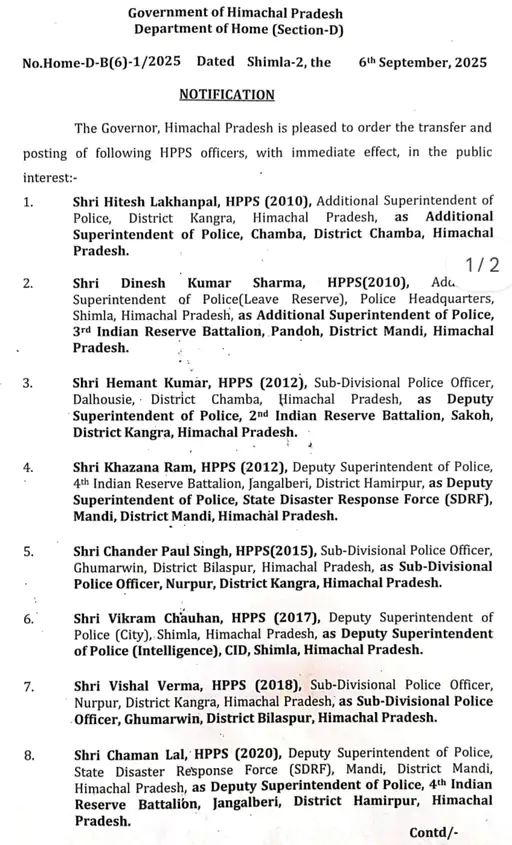 वहीं, साल 2010 बैच के एचपीएस अधिकारी हितेश लखनपाल, जो फिलहाल एएसपी कांगड़ा के पद पर थे, उन्हें एएसपी चंबा भेजा गया है। इसी बैच के दिनेश शर्मा, जो अब तक एएसपी लीव रिजर्व पुलिस मुख्यालय शिमला में थे, को एएसपी थर्ड बटालियन पंडोह का कार्यभार सौंपा गया है।