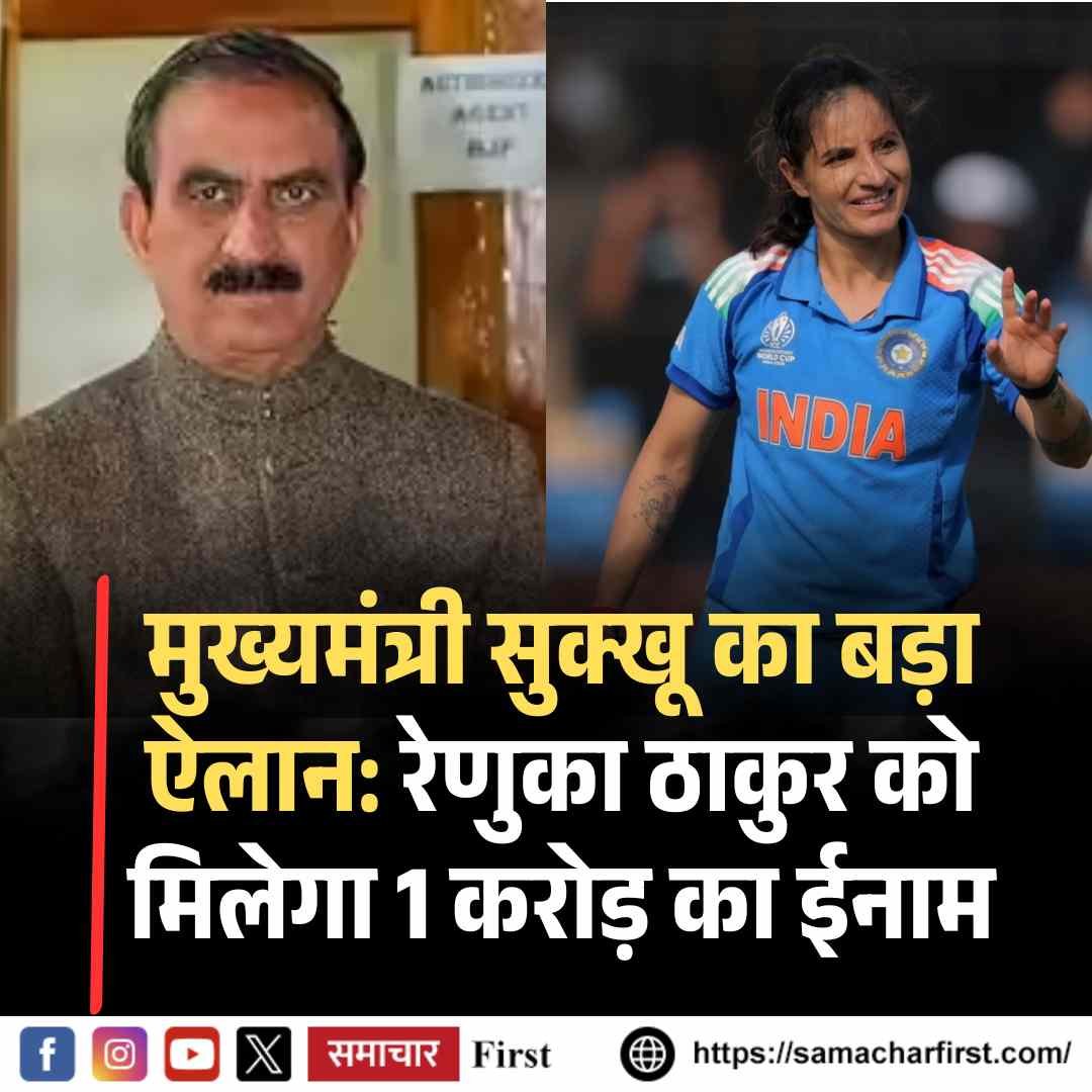 ➤ सीएम सुक्खू ने भारतीय महिला टीम की गेंदबाज रेणुका ठाकुर को देने की घोषणा की एक करोड़ की राशि