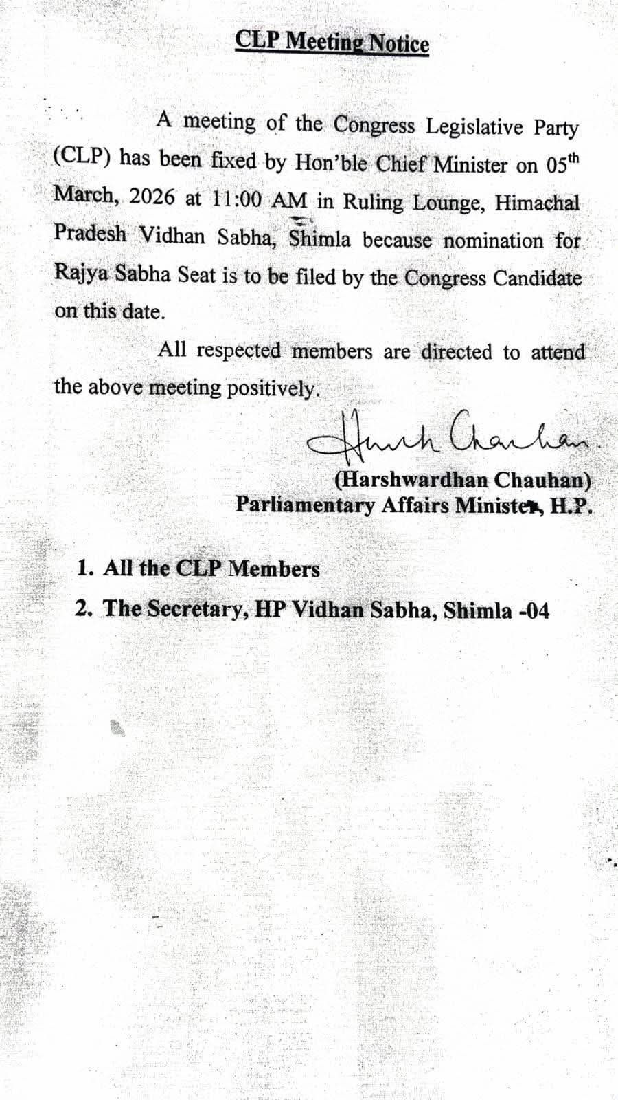 ➤ 5 मार्च सुबह 11 बजे हिमाचल विधानसभा परिसर में कांग्रेस विधायक दल की बैठक