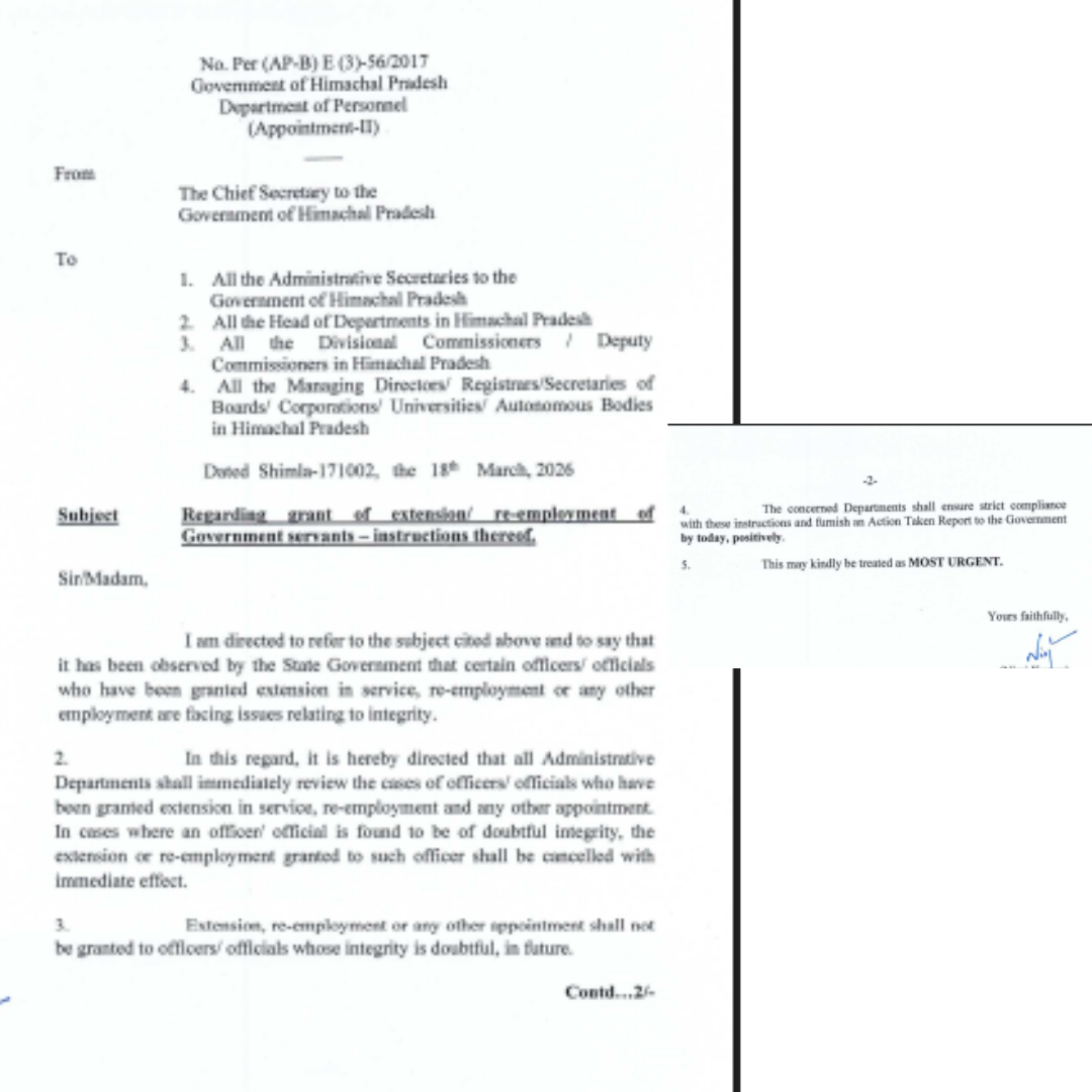 शिमला: हिमाचल प्रदेश में प्रशासनिक पारदर्शिता और ईमानदारी सुनिश्चित करने के लिए मुख्यमंत्री सुखविंदर सिंह सुक्खू की सरकार ने बड़ा कदम उठाया है। विधानसभा में मुद्दा उठने के कुछ ही समय बाद कार्मिक विभाग ने कड़ा आदेश जारी करते हुए उन सभी अधिकारियों और कर्मचारियों के मामलों की समीक्षा के निर्देश दिए हैं, जिन्हें सेवा विस्तार (Extension) या पुनर्रोजगार (Re-employment) दिया गया है।