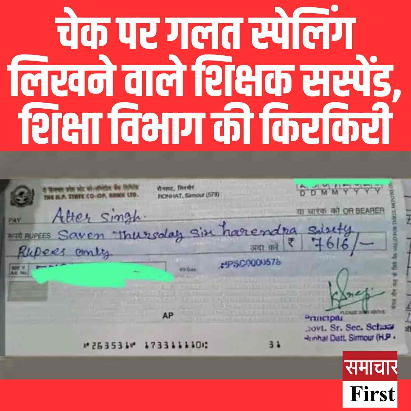 हिमाचल प्रदेश के शिक्षा विभाग में बड़ी लापरवाही सामने आई है। सिरमौर जिले के रोनहाट स्कूल में ड्राइंग मास्टर अत्तर सिंह द्वारा एक चेक पर की गई स्पेलिंग गलतियों के कारण पूरे शिक्षा विभाग की देशभर में किरकिरी हो गई। इसके बाद डिप्टी डायरेक्टर सिरमौर ने शनिवार को तत्काल प्रभाव से अत्तर सिंह को सस्पेंड कर दिया है। वहीं स्कूल प्रिंसिपल के खिलाफ भी कार्रवाई पर विचार चल रहा है।