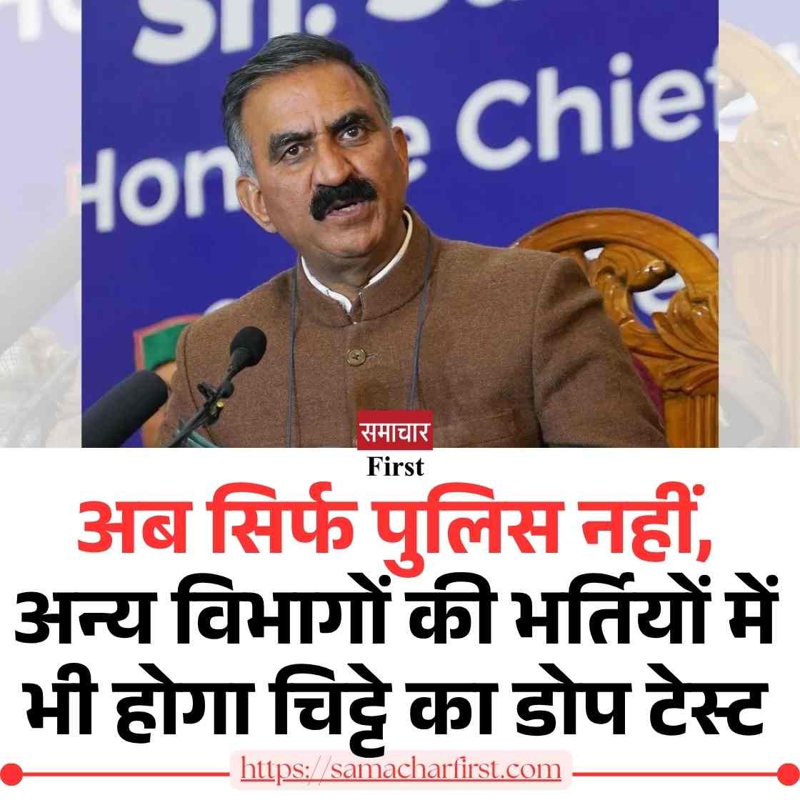 मुख्यमंत्री सुखविंदर सिंह सुक्खू ने यह घोषणा करते हुए कहा कि सरकार हिमाचल को चिट्टे मुक्त राज्य बनाने के लिए हर मोर्चे पर निर्णायक कार्रवाई कर रही है। उन्होंने बताया कि शुरुआत पुलिस भर्ती से की जा रही है, जहां पहली स्टेज पर ही डोप टेस्ट किया जा रहा है। लेकिन यह व्यवस्था सिर्फ पुलिस तक सीमित नहीं रहेगी — आने वाले समय में सभी विभागों की भर्तियों में डोप टेस्ट लागू किया जाएगा।