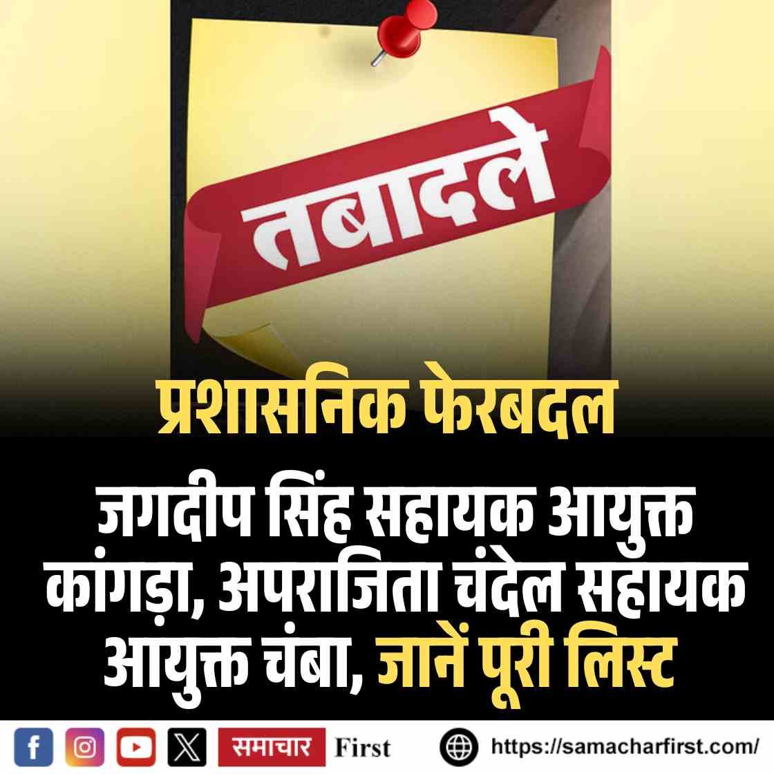 प्रशासनिक फेरबदल: जगदीप सिंह को सहायक आयुक्त कांगड़ा, अपराजिता चंदेल को सहायक आयुक्त चंबा, जानें पूरी लिस्‍ट