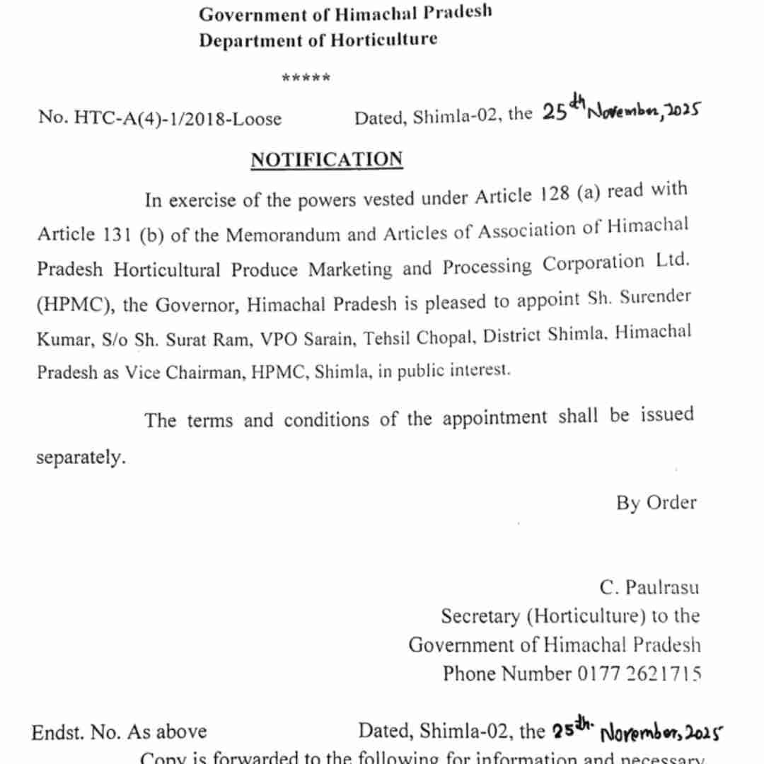 अधिसूचना बागवानी विभाग की ओर से जारी की गई है, जिसमें कहा गया है कि यह नियुक्ति जनहित में की गई है। आदेश के अनुसार, सुरेंद्र कुमार निवासी सरैन (चोपाल), जिला शिमला हैं।