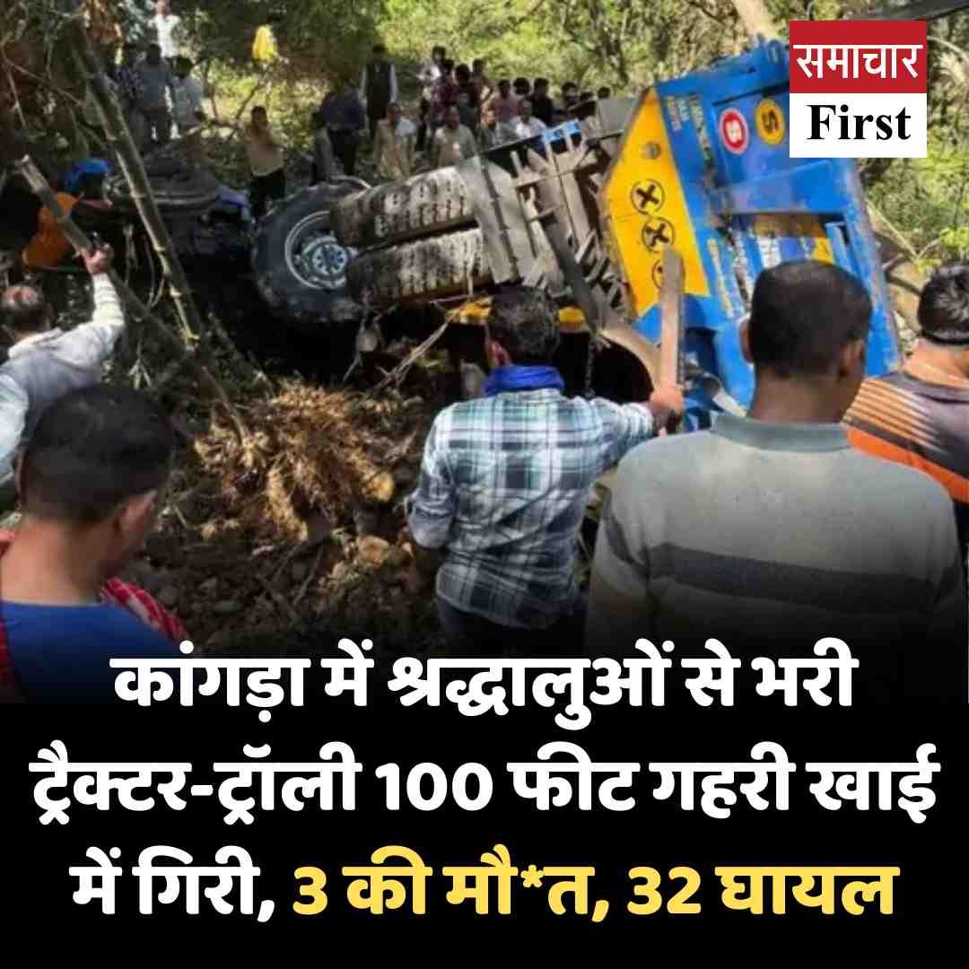कांगड़ा में श्रद्धालुओं से भरी ट्रैक्टर-ट्रॉली 100 फीट गहरी खाई में गिरी, 3 की मौत, 32 घायल