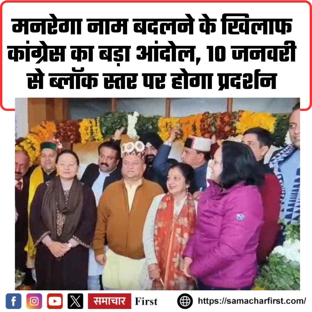 शिमला। केंद्र सरकार द्वारा मनरेगा का नाम बदलने के फैसले को लेकर कांग्रेस ने कड़ा विरोध दर्ज किया है। इसके खिलाफ पूरे देश में कांग्रेस धरना-प्रदर्शन कर रही है। हिमाचल प्रदेश में भी 10 जनवरी से ब्लॉक स्तर पर प्रदर्शन किए जाएंगे।