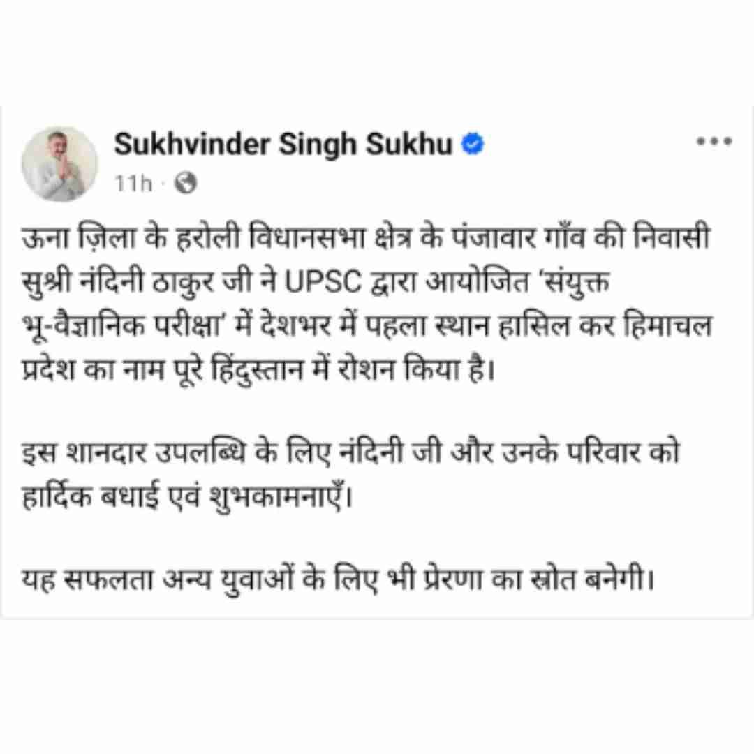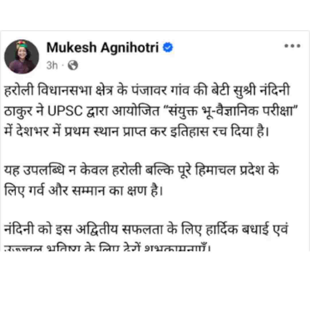 नंदिनी की उपलब्धि पर सुखविंदर सिंह सुक्खू और मुकेश अग्निहोत्री ने बधाई देते हुए इसे पूरे हिमाचल के लिए गर्व का क्षण बताया। उन्होंने कहा कि नंदिनी की सफलता प्रदेश के युवाओं के लिए प्रेरणास्रोत बनेगी और यह संदेश देती है कि मेहनत और लगन से कोई भी लक्ष्य हासिल किया जा सकता है।