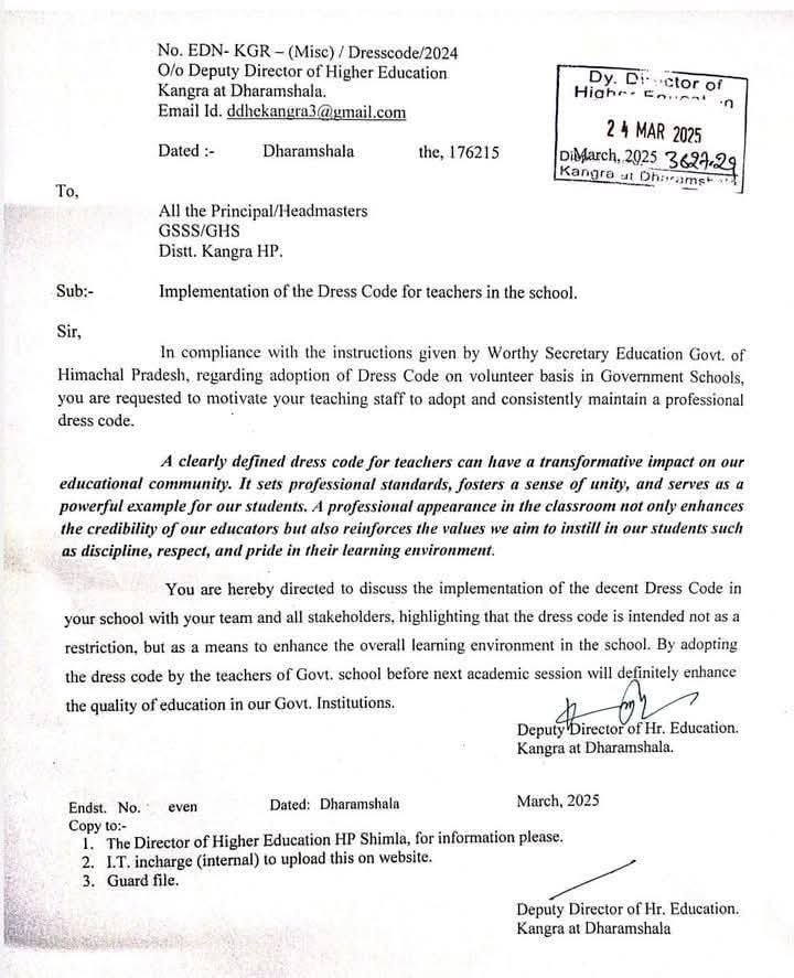 हिमाचल प्रदेश सरकार के निर्देशानुसार सरकारी स्कूलों में शिक्षकों के लिए ड्रेस कोड लागू किया जाएगा