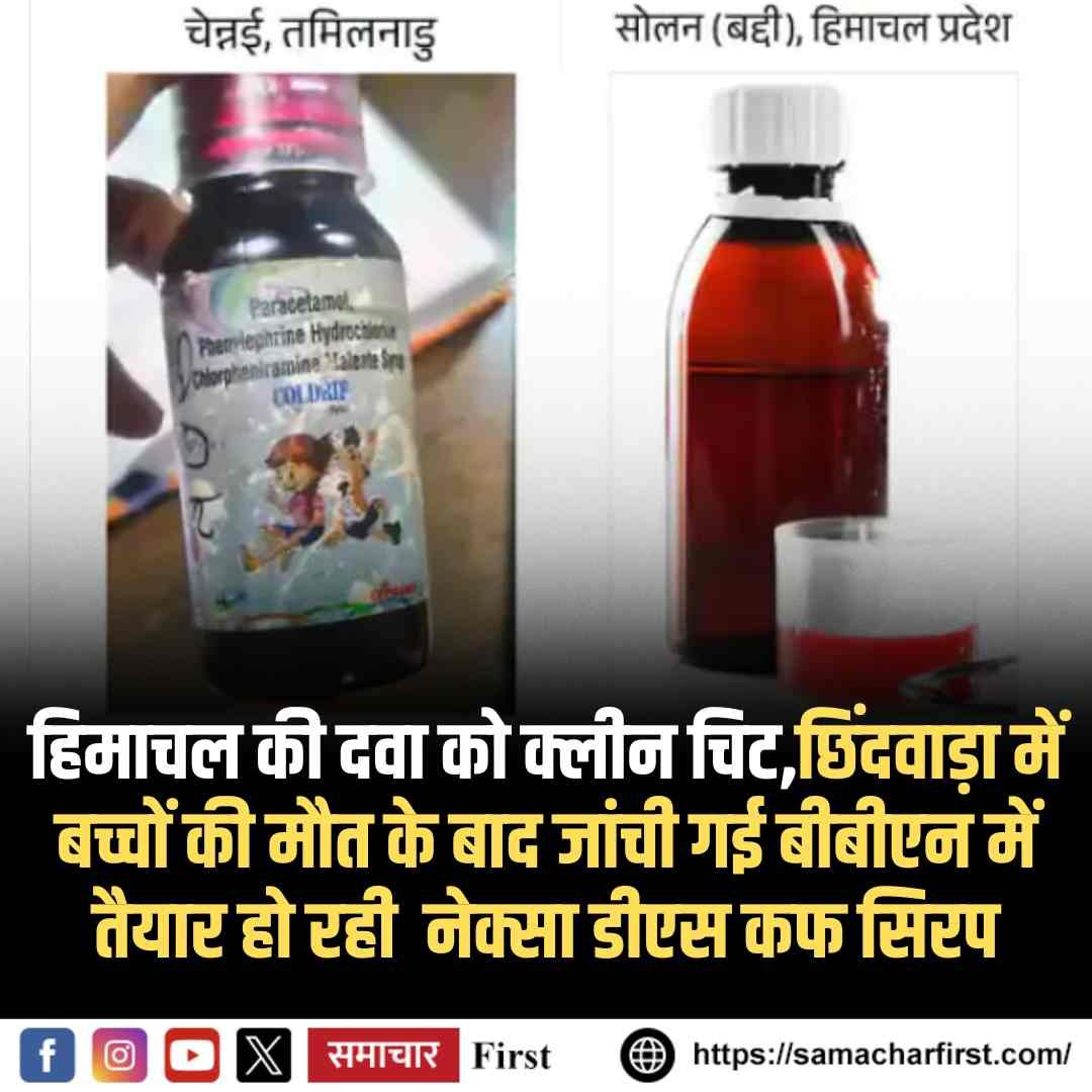 हिमाचल के स्वास्थ्य सचिव एम. सुधा ने बताया कि राज्य में पांच दवा कंपनियों से सैंपल उठाए गए थे, जिनमें सभी रिपोर्ट सकारात्मक आईं। स्वास्थ्य सचिव ने कहा कि यह जांच राज्य और केंद्र की संयुक्त टीम द्वारा की गई थी और अब नेक्सा डीएस सिरप पूरी तरह सुरक्षित घोषित किया गया है।