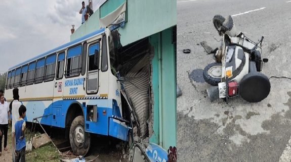 ऊना: हरियाणा रोडवेज की बस दुकान में जा घुसी, चपेट में आया स्कूटी चालक घायल