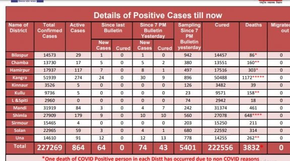 Covid 19: हिमाचल में बुधवार को आए 74 मामले, 1 मरीज की मौत