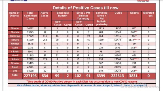 हिमाचल में मंगलवार को आए कोरोना के 102 मामले, 1 मरीज की मौत