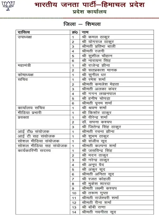 हिमाचल भाजपा को मिली नई संगठनात्मक कार्यकारिणी