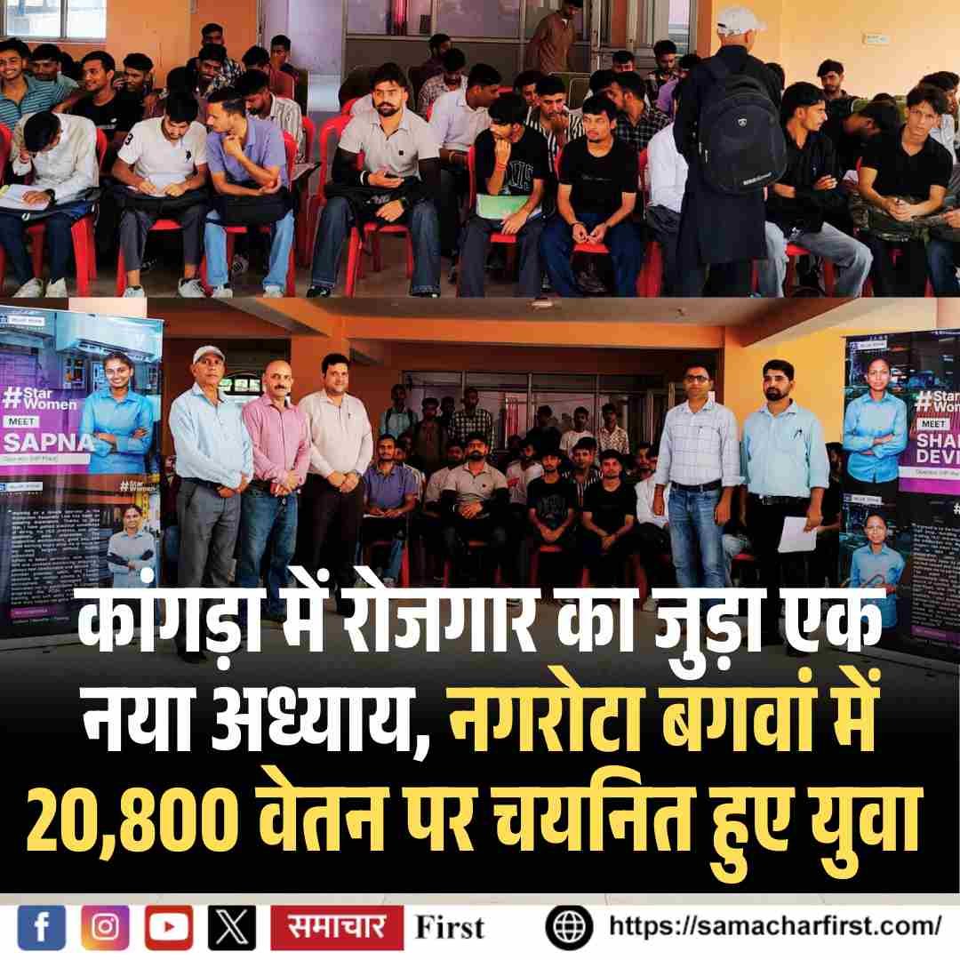 हिमाचल प्रदेश पर्यटन विकास निगम के चैयरमेन रैंक कैबिनेट एवं विधायक नगरोटा बगवां आरएस बाली के विजन और प्रतिबद्धता के तहत कांगड़ा जिले के नगरोटा बगवां में आयोजित रोजगार मेले ने युवाओं के लिए सुनहरा अवसर उपलब्ध करवाया। रोजगार विनिमय विभाग द्वारा आयोजित इस भर्ती मेले में ब्लू स्टार कंपनी, काला अंब के लिए साक्षात्कार हुए।