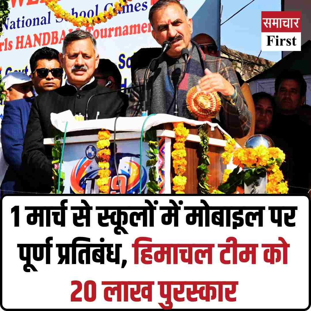 मुख्यमंत्री सुखविंद्र सिंह सुक्खू ने घुमारवीं में 69वीं अंडर-19 छात्रा हैंडबॉल स्कूल प्रतियोगिता के समापन अवसर पर घोषणा की कि 1 मार्च के बाद प्रदेश के सभी सरकारी और निजी स्कूलों में विद्यार्थियों के मोबाइल फोन लाने पर पूर्ण प्रतिबंध रहेगा। स्कूल परिसर में मोबाइल मिलने पर 500 रुपये जुर्माना, मोबाइल जब्त किया जाएगा और अभिभावकों को बुलाकर समझाया जाएगा। बार-बार उल्लंघन पर शिक्षा विभाग द्वारा तय SOP के तहत अनुशासनात्मक कार्रवाई होगी।