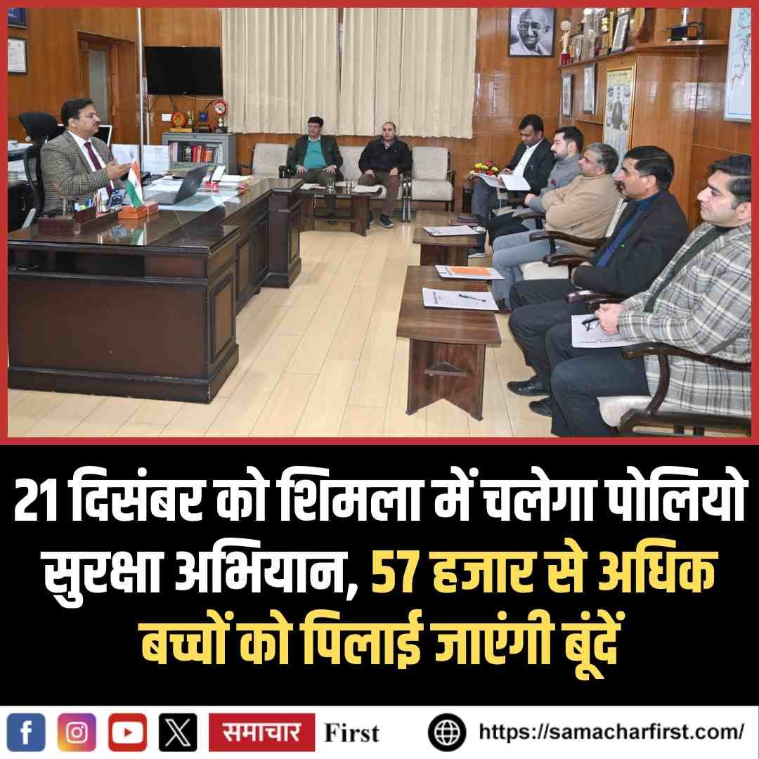 जिला शिमला में 21 दिसंबर 2025  को राष्ट्रीय पोलियो टीकाकरण दिवस के अवसर पर विशेष अभियान चलाया जाएगा। इस दौरान जिले के 57,010 बच्चों को ओरल पोलियो वैक्सीन पिलाने का लक्ष्य रखा गया है। अभियान की तैयारियों को लेकर उपायुक्त अनुपम कश्यप की अध्यक्षता में जिला टीकाकरण टास्क फोर्स की बैठक आयोजित की गई।