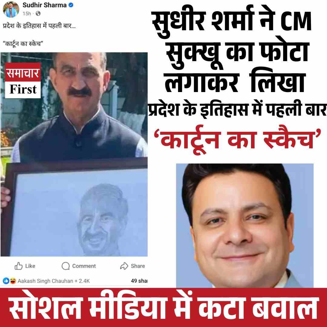 हिमाचल प्रदेश की राजनीति एक बार फिर सोशल मीडिया की सुर्खियों में है। धर्मशाला से भारतीय जनता पार्टी (BJP) के विधायक सुधीर शर्मा ने अपने फेसबुक अकाउंट पर एक ऐसा पोस्ट किया, जिसने राजनीतिक हलचल मचा दी है। सुधीर ने अपनी पोस्ट में मुख्यमंत्री सुखविंदर सिंह सुक्खू की एक तस्वीर और उसके साथ एक स्केच साझा करते हुए लिखा – “प्रदेश के इतिहास में पहली बार कार्टून का स्केच…”
