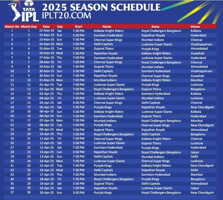 IPL 2025 का शेड्यूल रविवार को जारी कर दिया गया। टूर्नामेंट की शुरुआत 22 मार्च को ईडन गार्डन्स, कोलकाता में कोलकाता नाइट राइडर्स (KKR) और रॉयल चैलेंजर्स बैंगलोर (RCB) के मुकाबले से होगी। फाइनल मुकाबला 25 मई को इसी मैदान पर खेला जाएगा धर्मशाला में तीन अहम मुकाबले होंगे। वहीं सीजन में 10 टीमें 12 वेन्यू पर 65 दिनों में कुल 74 मुकाबले खेलेंगी। दोपहर के मैच दोपहर 3:30 बजे, जबकि शाम के मुकाबले शाम 7:30 बजे से शुरू होंगे।