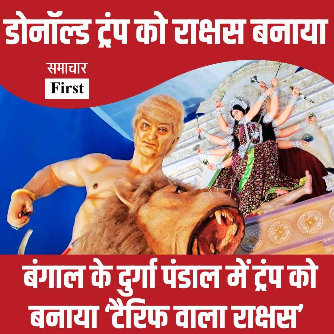 पश्चिम बंगाल के मुर्शिदाबाद जिले के बहरामपुर स्थित खागरा श्मशान घाट दुर्गा पूजा समिति इस बार सुर्खियों में है। समिति ने अपने 59वें दुर्गोत्सव को खास बनाने के लिए असुर की प्रतिमा अमेरिकी पूर्व राष्ट्रपति डोनाल्ड ट्रंप के रूप में तैयार करवाई है। इस अनोखे थीम पंडाल को देखने के लिए भारी संख्या में लोग पहुंच रहे हैं।