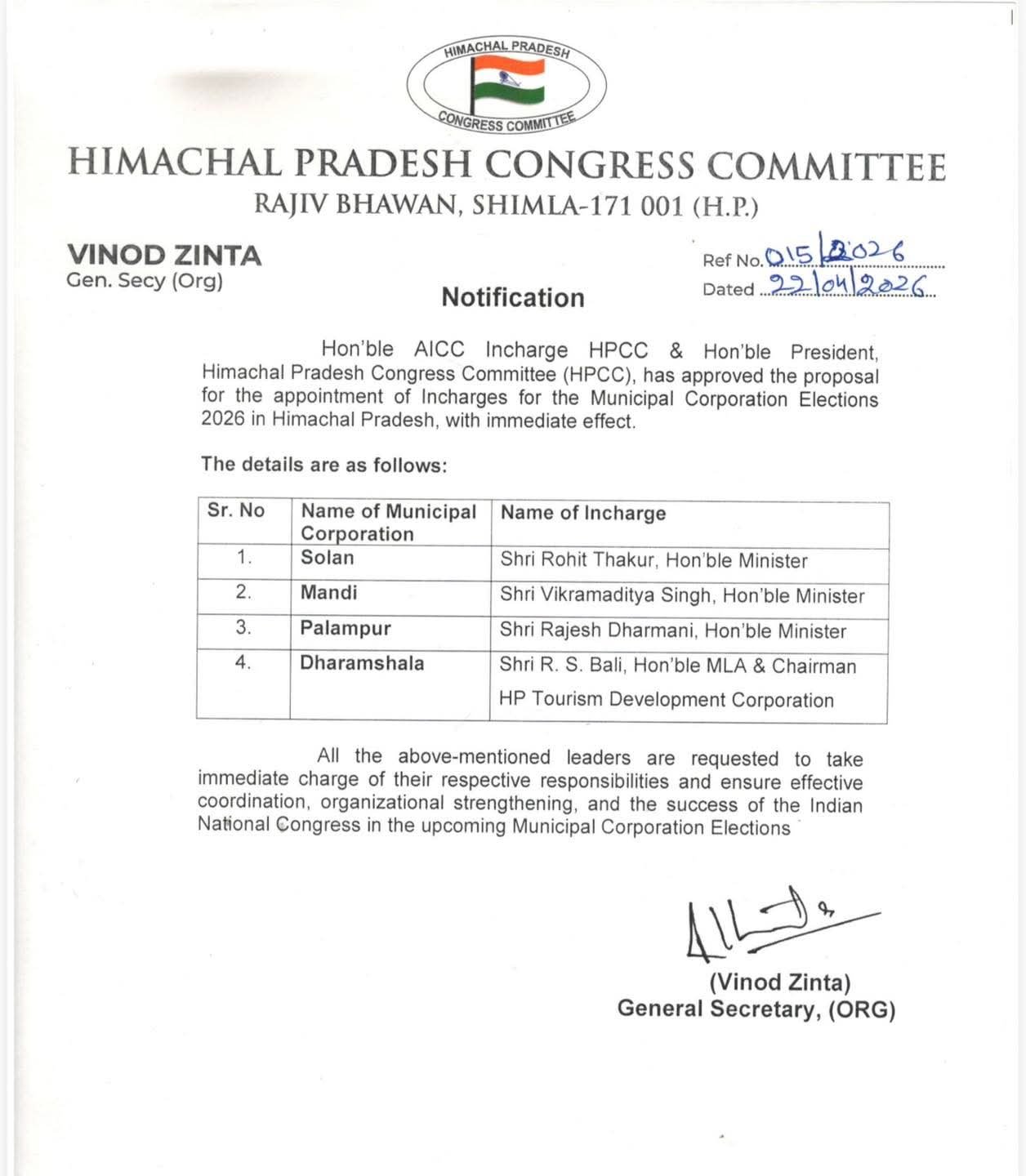 हिमाचल प्रदेश कांग्रेस कमेटी (HPCC) ने प्रदेश में होने वाले आगामी नगर निगम चुनाव 2026 के लिए अपनी बिसात बिछा दी है। इसी कड़ी में राजीव भवन, शिमला से एक महत्वपूर्ण अधिसूचना जारी की गई है, जिसमें चार प्रमुख नगर निगमों के लिए प्रभारियों की नियुक्ति की गई है।आरएस बाली (R.S. Bali को  धर्मशाला नगर निगम का प्रभारी नियुक्त किया गया है।