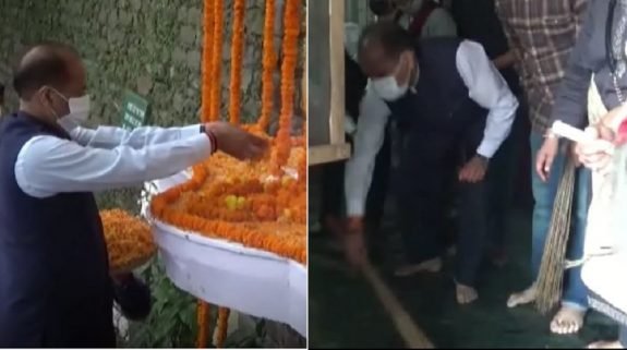 गांधी जयंती पर मंदिर में झाड़ू लगाकर CM ने किया सफाई अभियान का आगाज